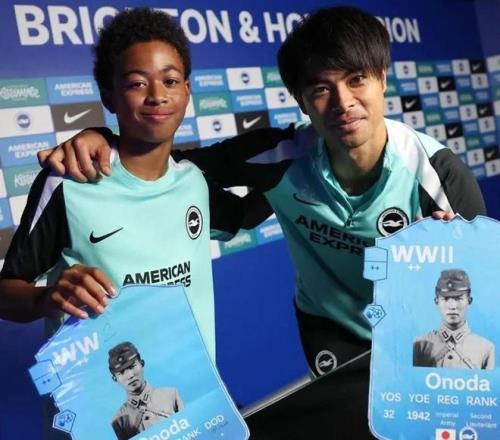 然而令人震惊并且愤怒的是,三笘薰和这位小球员举着卡片上,赫然印着日本二战战犯小野田宽郎的照片!而且他们都认为小野田宽郎是日本的英雄。